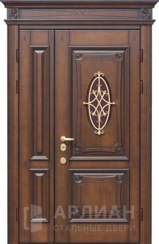 Фото «Входная двустворчатая дверь со стеклом и ковкой в загородный дом №14»